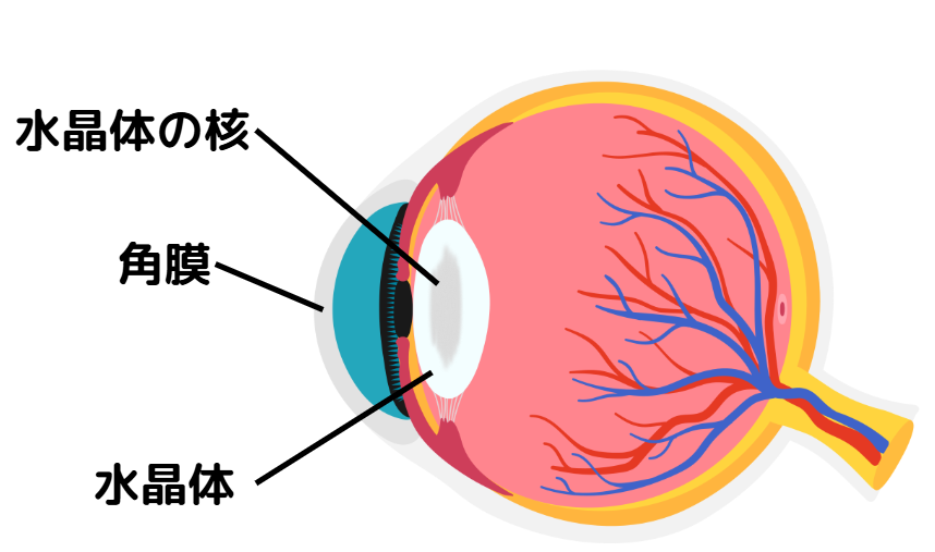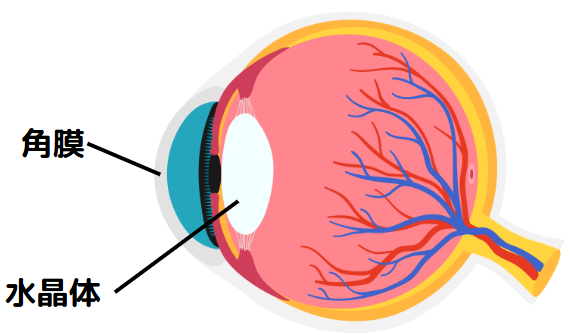 水晶体は瞳を通った光の向きを変え、網膜(眼球の奥の光センサー)にピントを合わせるためのレンズとしての働きがあります。